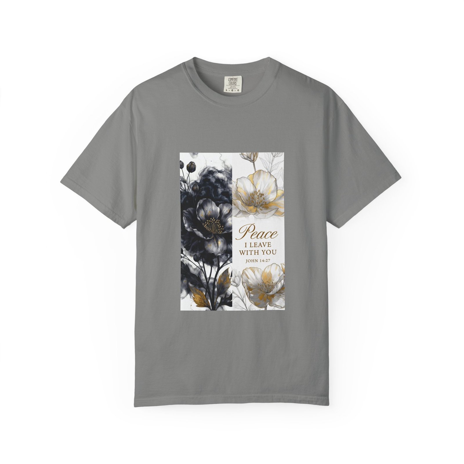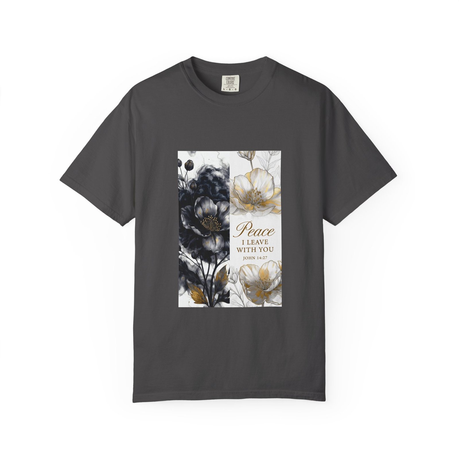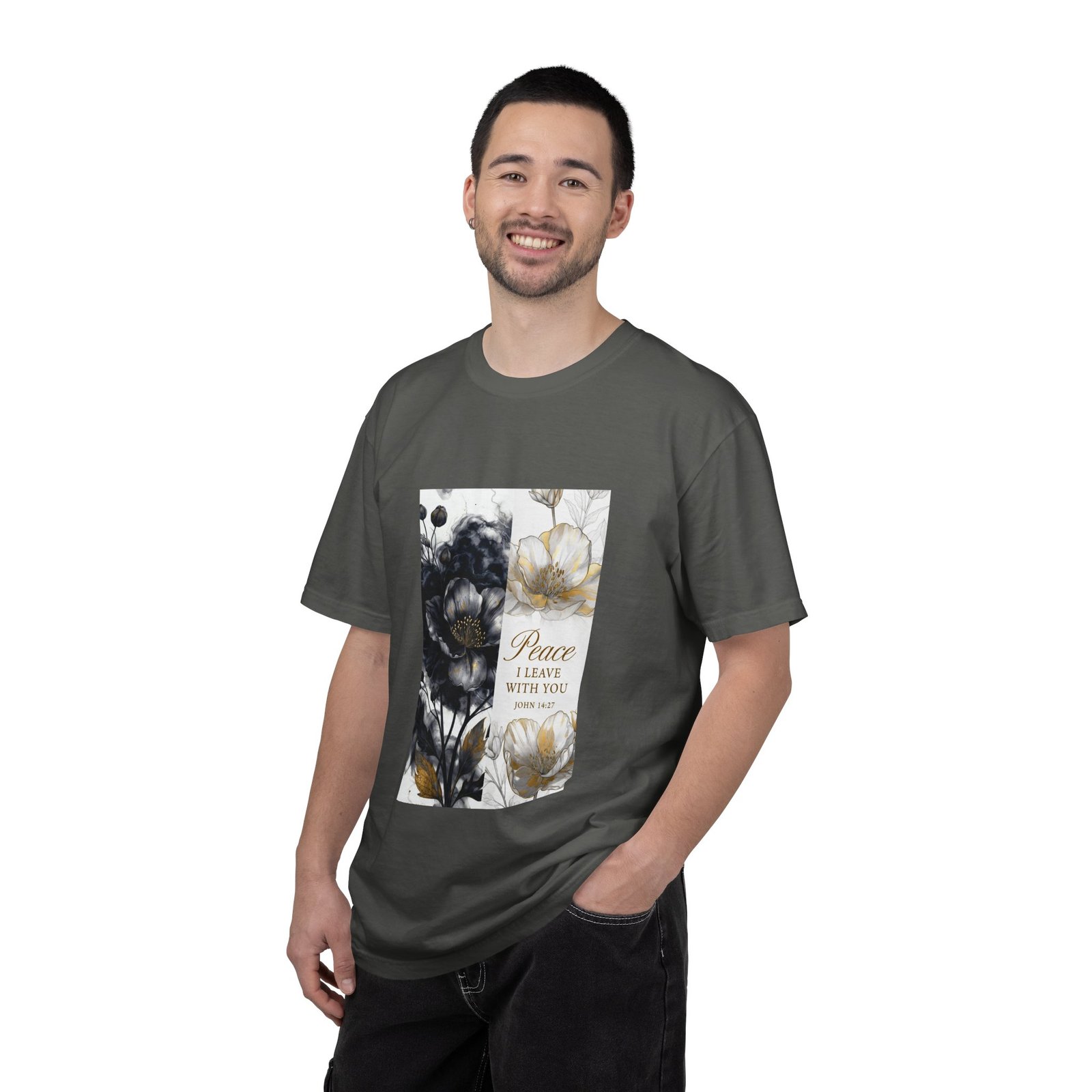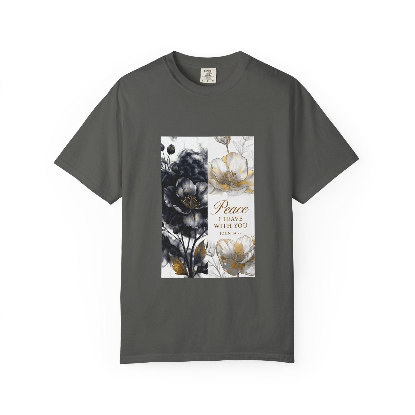 Soft, heavyweight comfort with a quiet, reverent design. This garment-dyed cotton tee wears in gently — the fabric feels lived-in and calm right from the first wear. The front panel blends charcoal florals and warm gold accents around the phrase “Peace I leave with you,” creating a contemplative, elegant look that reads like a wearable keepsake. It sits loosely without clinging, so it layers easily over long sleeves or slips under a jacket for quieter moments. Wear it to memory gatherings, church meetups, or evenings of reflection; it’s for people who want their clothing to carry a voice of comfort, not shout. The muted tones and subtle texture make it easy to pair with denim, cozy joggers, or a soft cardigan when you need something gentle and steady.