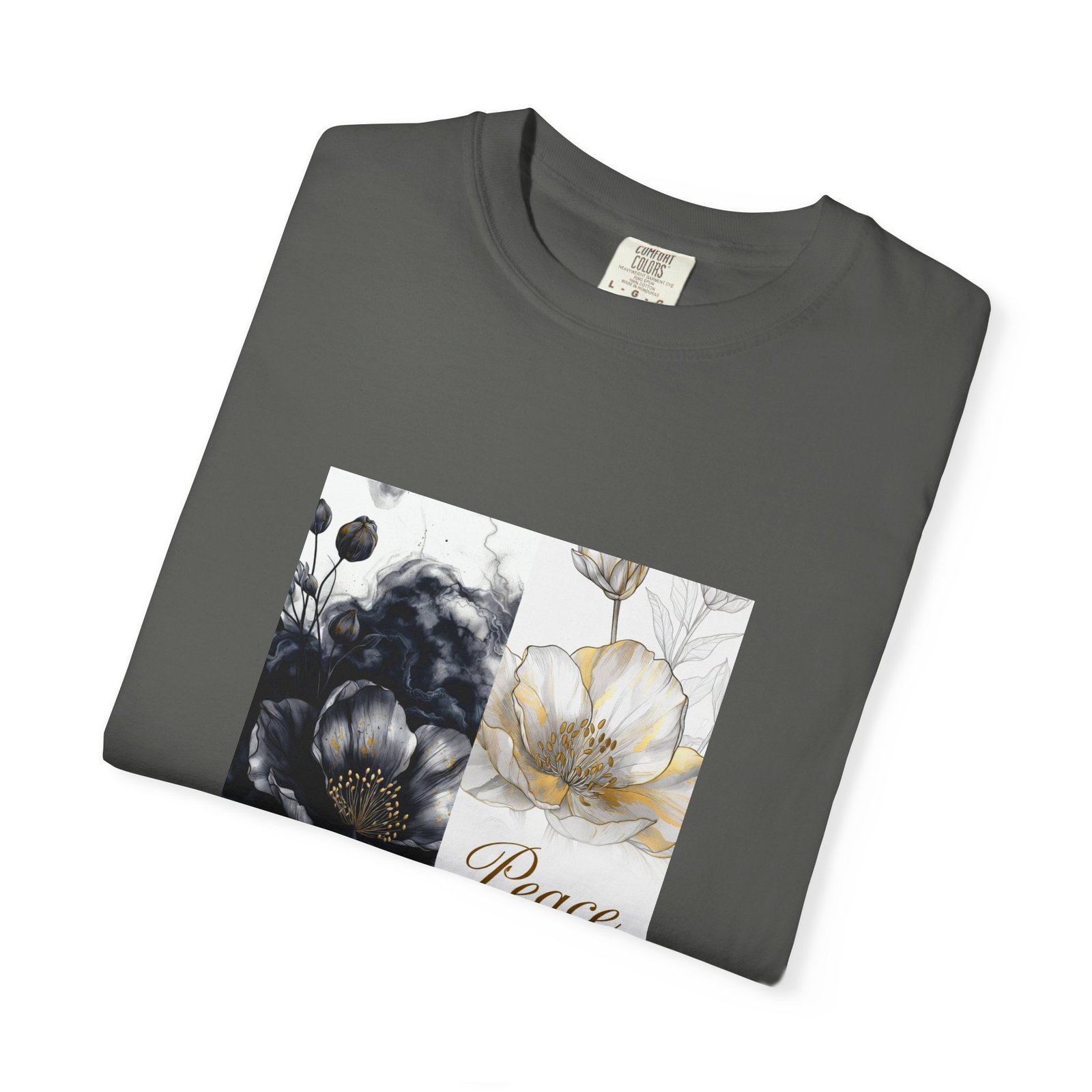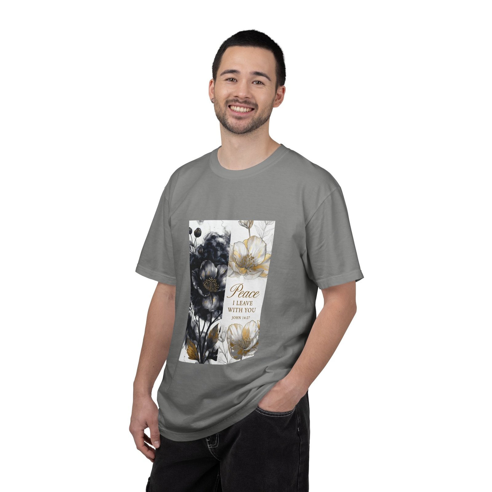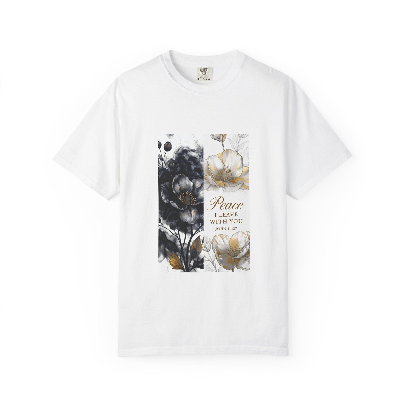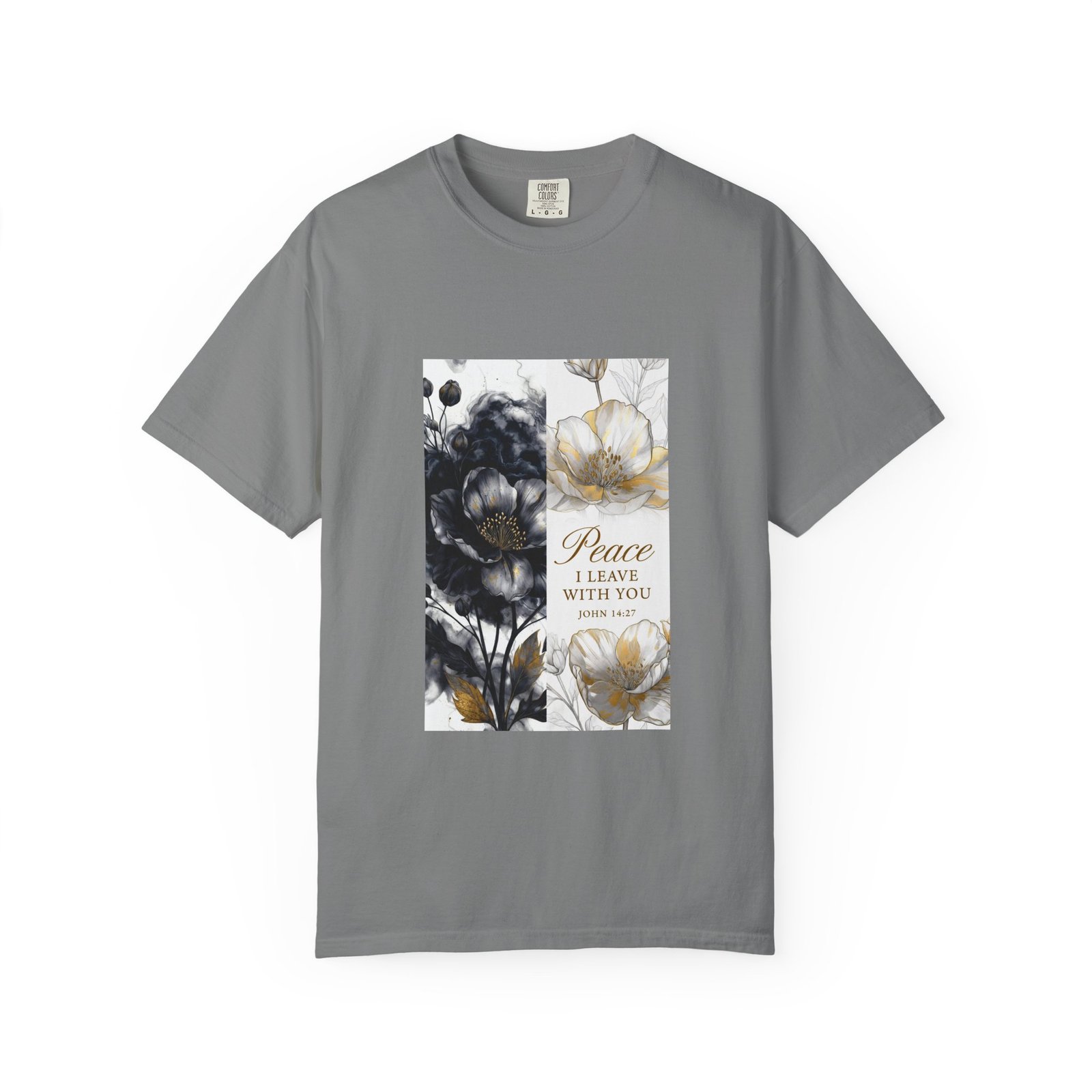 Soft, heavyweight comfort with a quiet, reverent design. This garment-dyed cotton tee wears in gently — the fabric feels lived-in and calm right from the first wear. The front panel blends charcoal florals and warm gold accents around the phrase “Peace I leave with you,” creating a contemplative, elegant look that reads like a wearable keepsake. It sits loosely without clinging, so it layers easily over long sleeves or slips under a jacket for quieter moments. Wear it to memory gatherings, church meetups, or evenings of reflection; it’s for people who want their clothing to carry a voice of comfort, not shout. The muted tones and subtle texture make it easy to pair with denim, cozy joggers, or a soft cardigan when you need something gentle and steady.