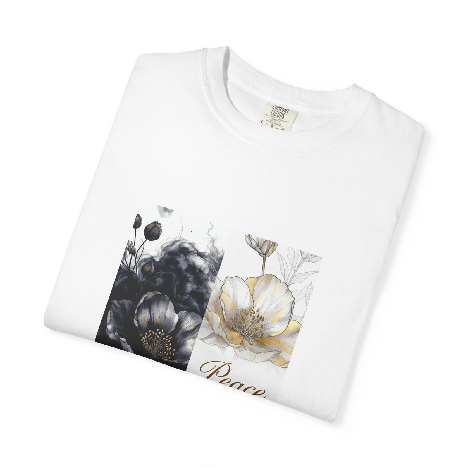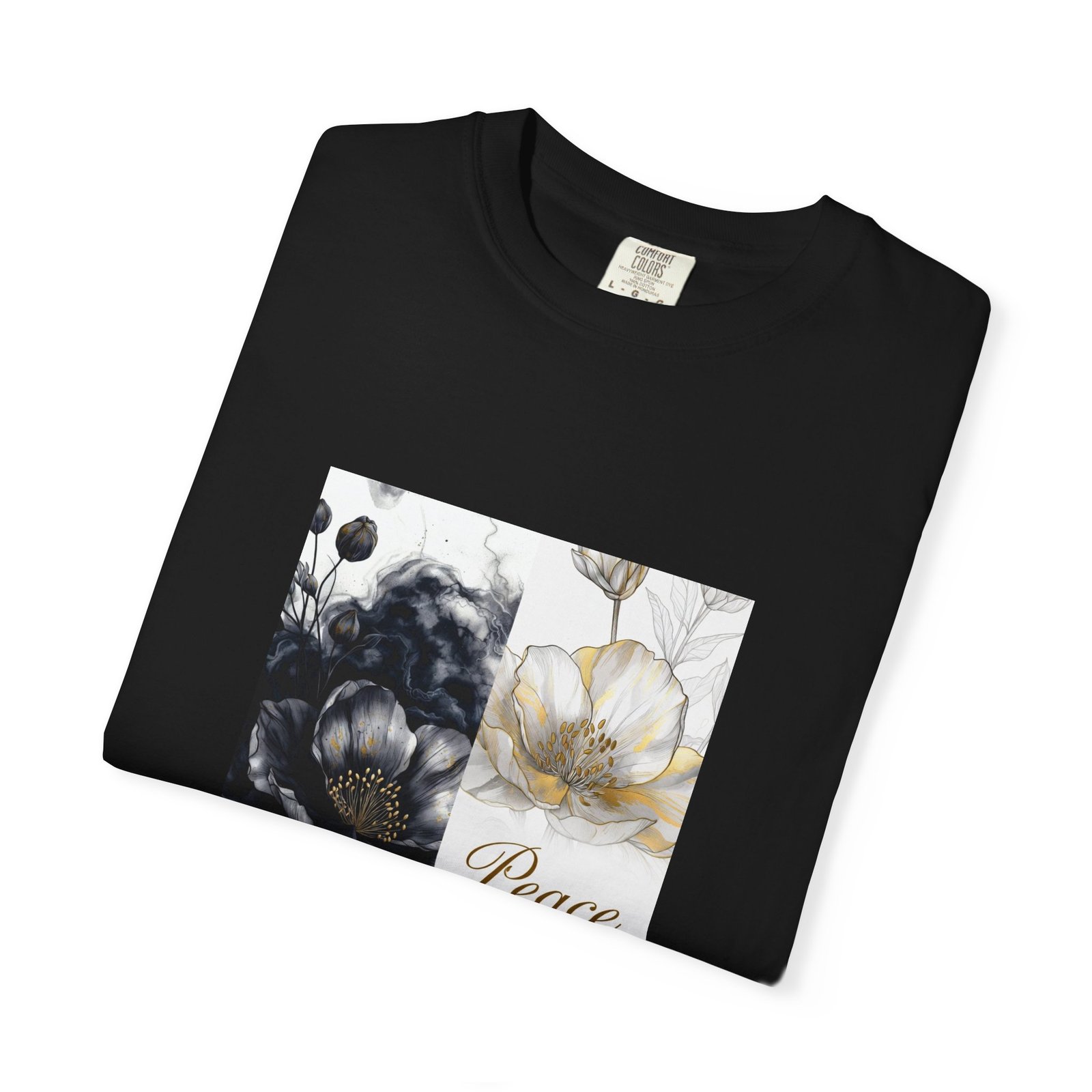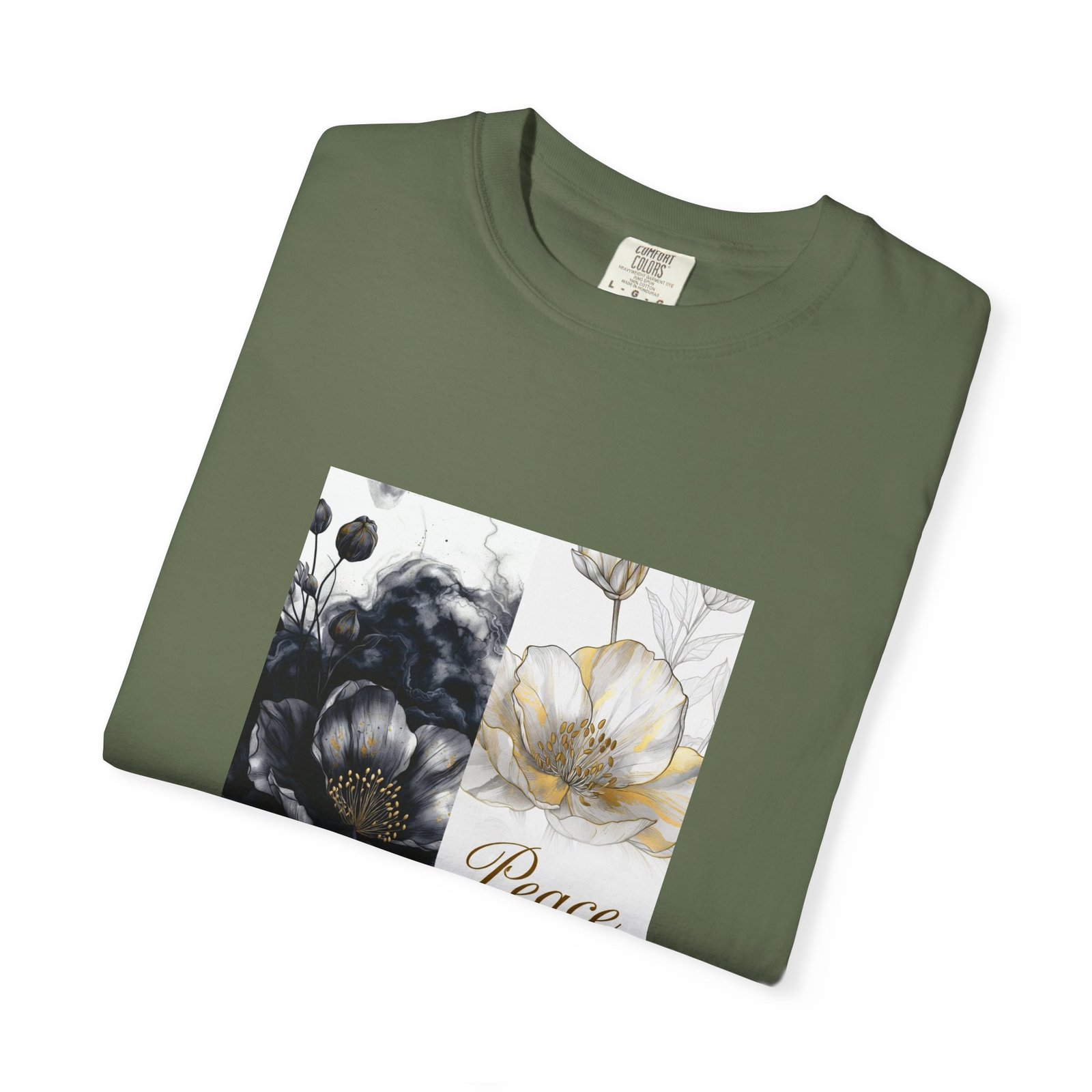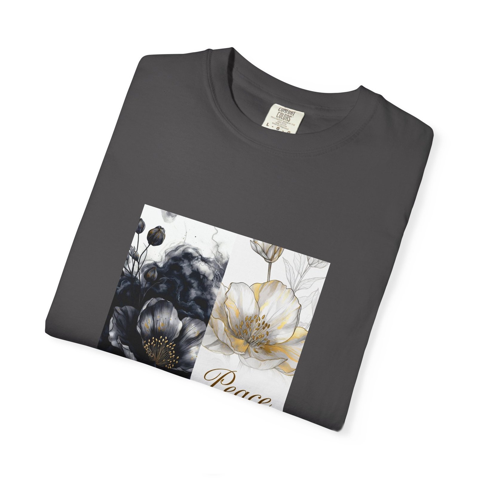 Soft, heavyweight comfort with a quiet, reverent design. This garment-dyed cotton tee wears in gently — the fabric feels lived-in and calm right from the first wear. The front panel blends charcoal florals and warm gold accents around the phrase “Peace I leave with you,” creating a contemplative, elegant look that reads like a wearable keepsake. It sits loosely without clinging, so it layers easily over long sleeves or slips under a jacket for quieter moments. Wear it to memory gatherings, church meetups, or evenings of reflection; it’s for people who want their clothing to carry a voice of comfort, not shout. The muted tones and subtle texture make it easy to pair with denim, cozy joggers, or a soft cardigan when you need something gentle and steady.