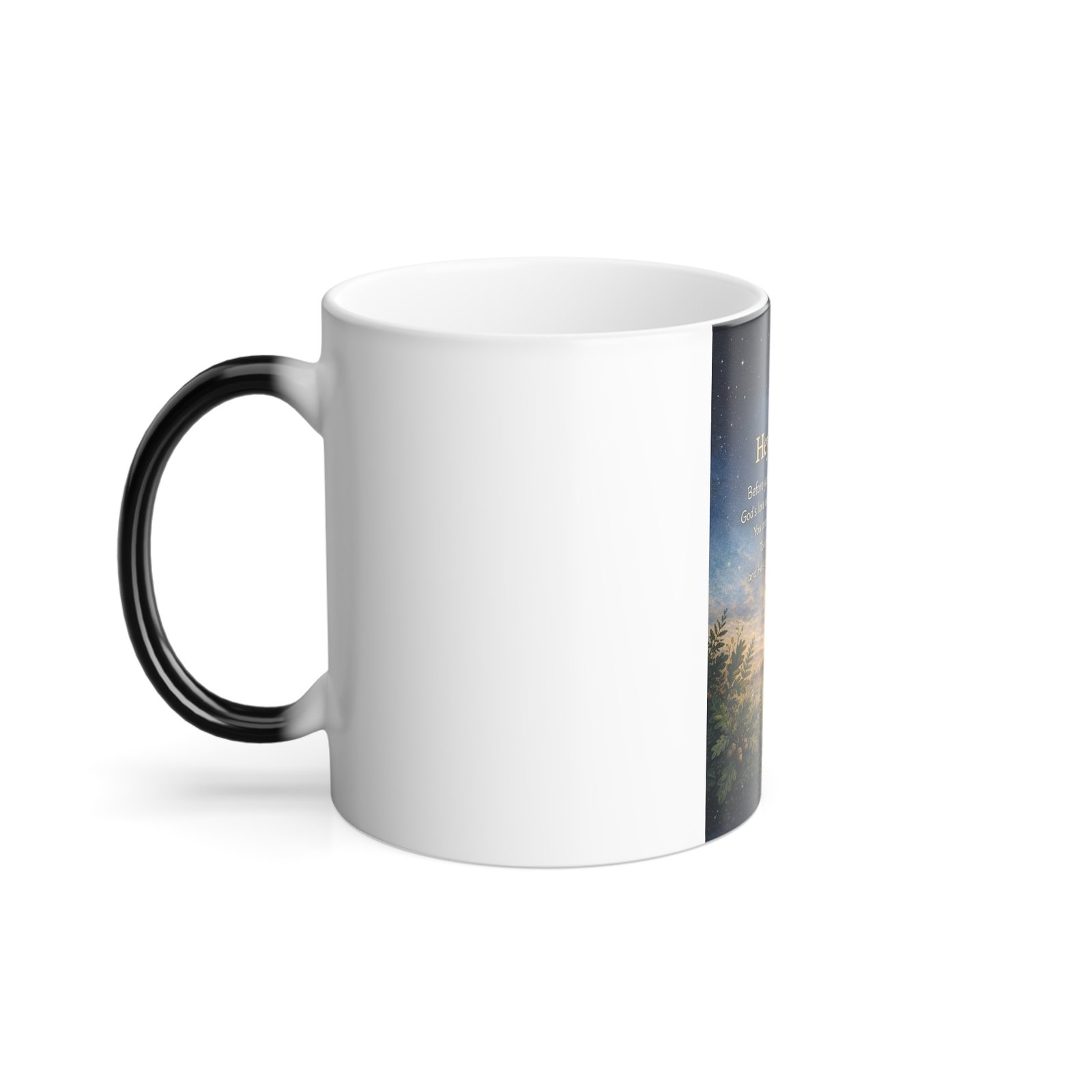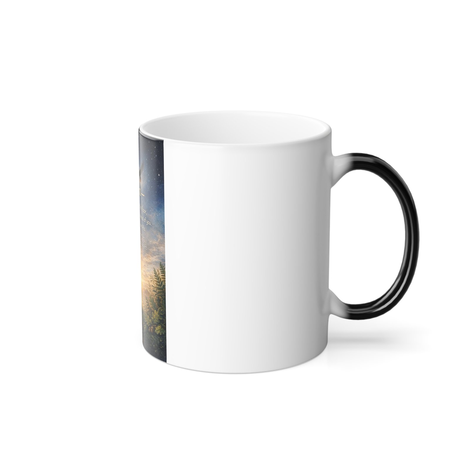 This 11oz color-morphing mug turns a quiet morning drink into a small moment of wonder. At room temperature the scene reads soft and subtle; pour in something hot and a vivid sunrise landscape with a soaring bird and an encouraging verse blooms across the glossy wraparound print. The black exterior and white interior create a refined contrast, while the heat-reactive coating reveals bright, crisp colors that feel handcrafted and thoughtful. Sturdy ceramic construction, lead- and BPA-free materials, and microwave-safe convenience make it easy to use daily. Recommended hand wash to keep the glossy finish and color-transition effect looking like new.